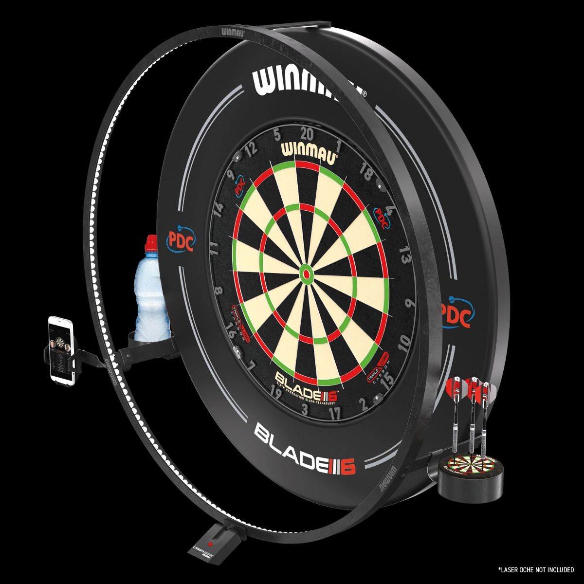 Paras Dart Zone -lisävarustesarja. Aseta puhelimesi turvallisesti laudan sivulle, jotta voit seurata pisteitä tai pelata webbikameralla. Pidä virvokkeet käsillä juomatelineen avulla. Pidä kaikki tikkasi toimintavalmiina alkuperäisen Winmau Dart Dockin avulla.