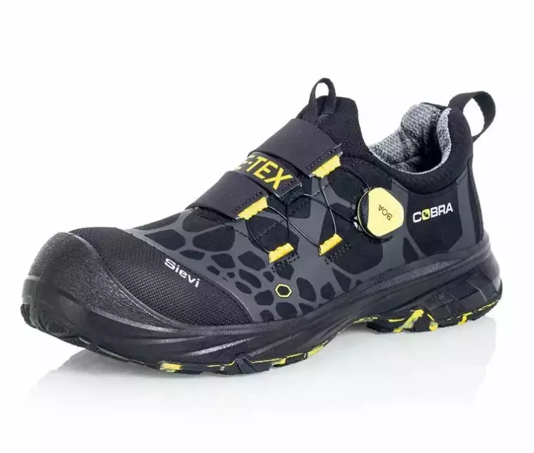 Sievi Cobra GT Roller+ S3 on hengittävä ja vedenpitävä turvakenkä. Kevyt metalliton turvakärki sekä teräksinen naulaanastumissuoja. BOA® Fit-kiinnitysmekanismi helpottaa kengän pukemista jalkaan. Nauhoitus lukitaan painamalla rulla alas ja kiristäminen tapahtuu vain rullaa pyöräyttämällä! Kengät ovat myös helppo riisua; nauhoitus vapautuu vaivattomasti nostamalla rullaa. Kengän päällinen on vettä ja likaa hylkivää mikrokuitua. Gore-Tex®-vuori on vedenpitävä vuorimateriaali, joka pitää kosteuden jalkineen ulkopuolella, mutta samalla kuitenkin antaa jalan hengittää. PU-kärkikuppi tekee tästä turvakengästä sopivan myös kovaan käyttöön. Sievi Cobra GT Roller+ S3 turvakengässä on TractionPro -kitkapohja, joka varmistaa erinomaisen pidon ja kulutuskestävyyden sekä antaa iskunvaimennusta etenkin jalan tukialueille. Kengän pohja kestää öljyä ja useita kemikaaleja sekä kuumuutta 300 °C asti.