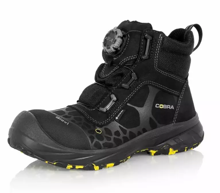 Sievi Cobra GT RollerH+ S3 on sporttinen, hengittävä ja vedenpitävä turvakenkä. Kevyt metalliton turvakärki sekä teräksinen naulaanastumissuoja. BOA® Fit-kiinnitysmekanismi helpottaa kengän pukemista jalkaan. Nauhoitus lukitaan painamalla rulla alas ja kiristäminen tapahtuu vain rullaa pyöräyttämällä! Kengät ovat myös helppo riisua; nauhoitus vapautuu vaivattomasti nostamalla rullaa. Kengän päällinen on vettä ja likaa hylkivää mikrokuitua. Gore-Tex®-vuori on vedenpitävä vuorimateriaali, joka pitää kosteuden jalkineen ulkopuolella, mutta samalla kuitenkin antaa jalan hengittää. Turvakengässä on nilkkaa tukeva Memory Foam, joka myötäilee käyttäjän jalkaa ja vaimentaa nilkkaan kohdistuvia iskuja. PU-kärkikuppi tekee tästä turvakengästä sopivan myös kovaan käyttöön. Sievi Cobra GT RollerH+ S3 turvakengässä on TractioPro -kitkapohja, joka varmistaa erinomaisen pidon ja kulutuskestävyyden sekä antaa iskunvaimennusta etenkin jalan tukialueille. Kengän pohja kestää öljyä ja useita kemikaaleja sekä kuumuutta 300 °C asti.