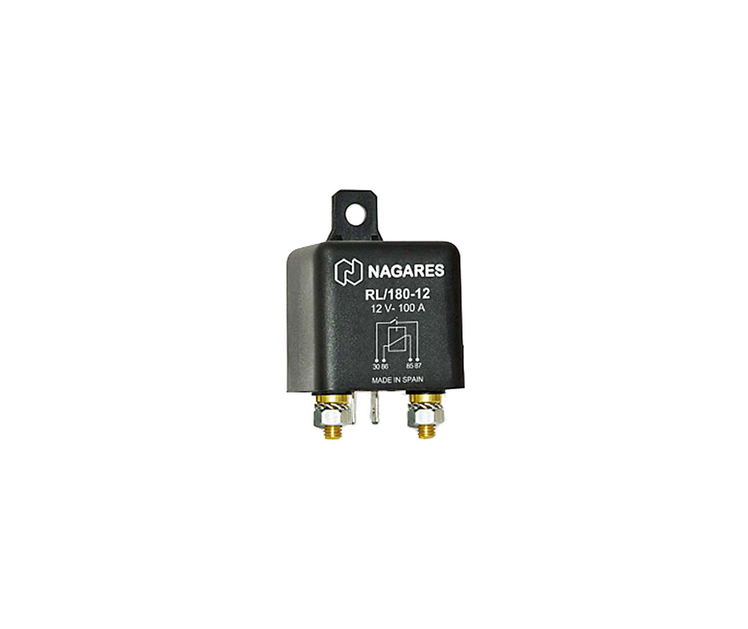 HD-rele 12V 100A, jota voidaan käyttää erotusreleenä akkuryhmien erottamiseen. Yhdistetään generaattorin D+ ohjausta varten tai vaihtoehtoisesti kytkimeen.